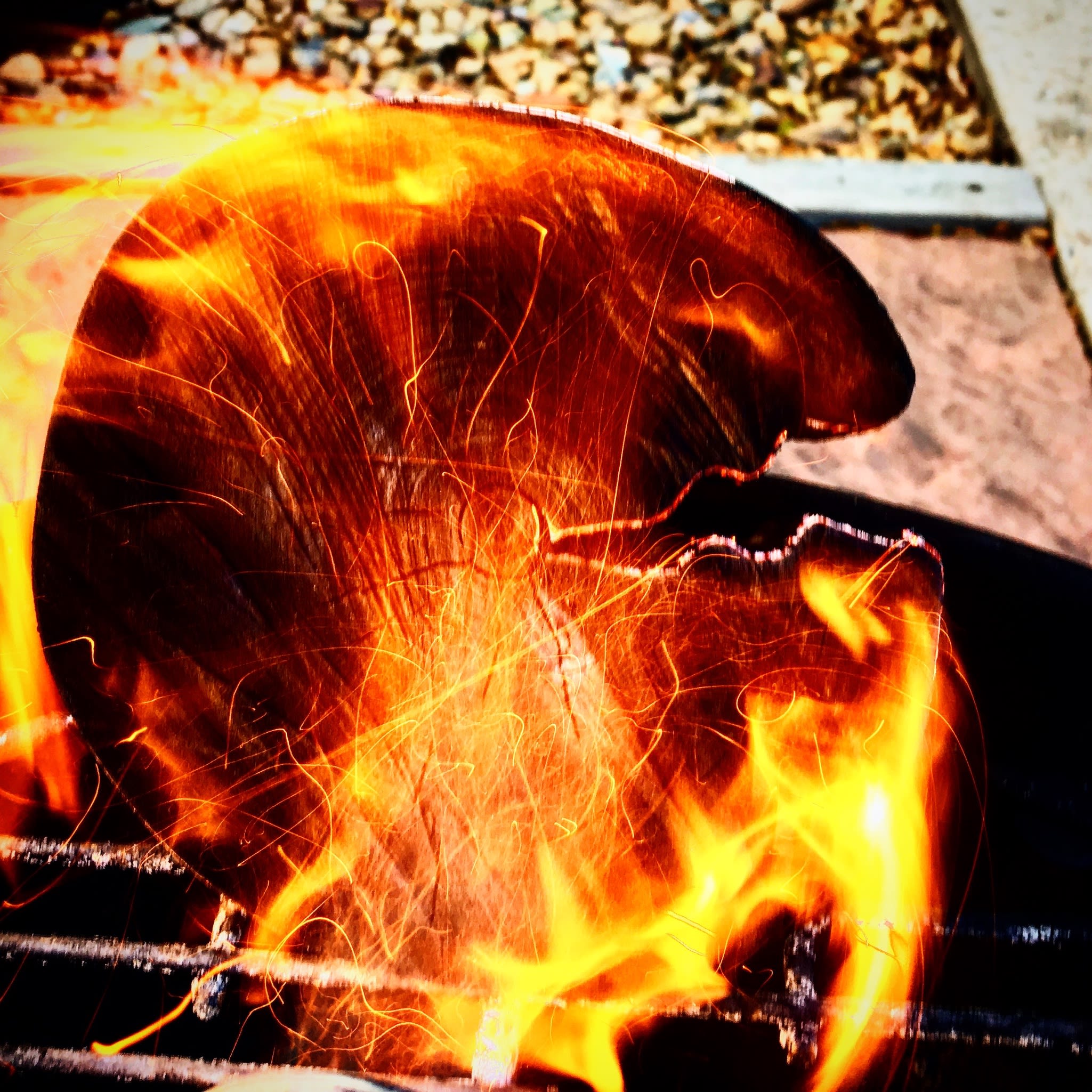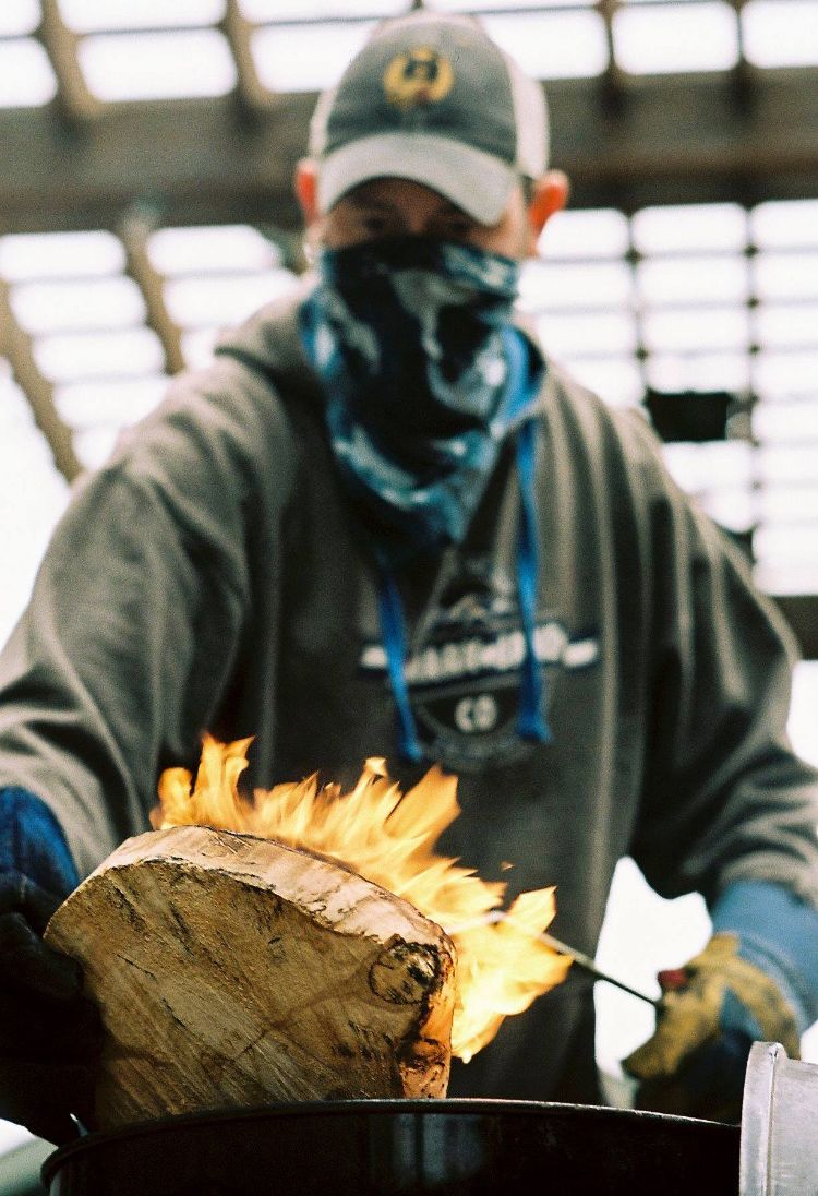 Rick Talley hand-charring an aspen wood disc that will contribute to finishing a batch of Locke + Co. Distilling whiskey.