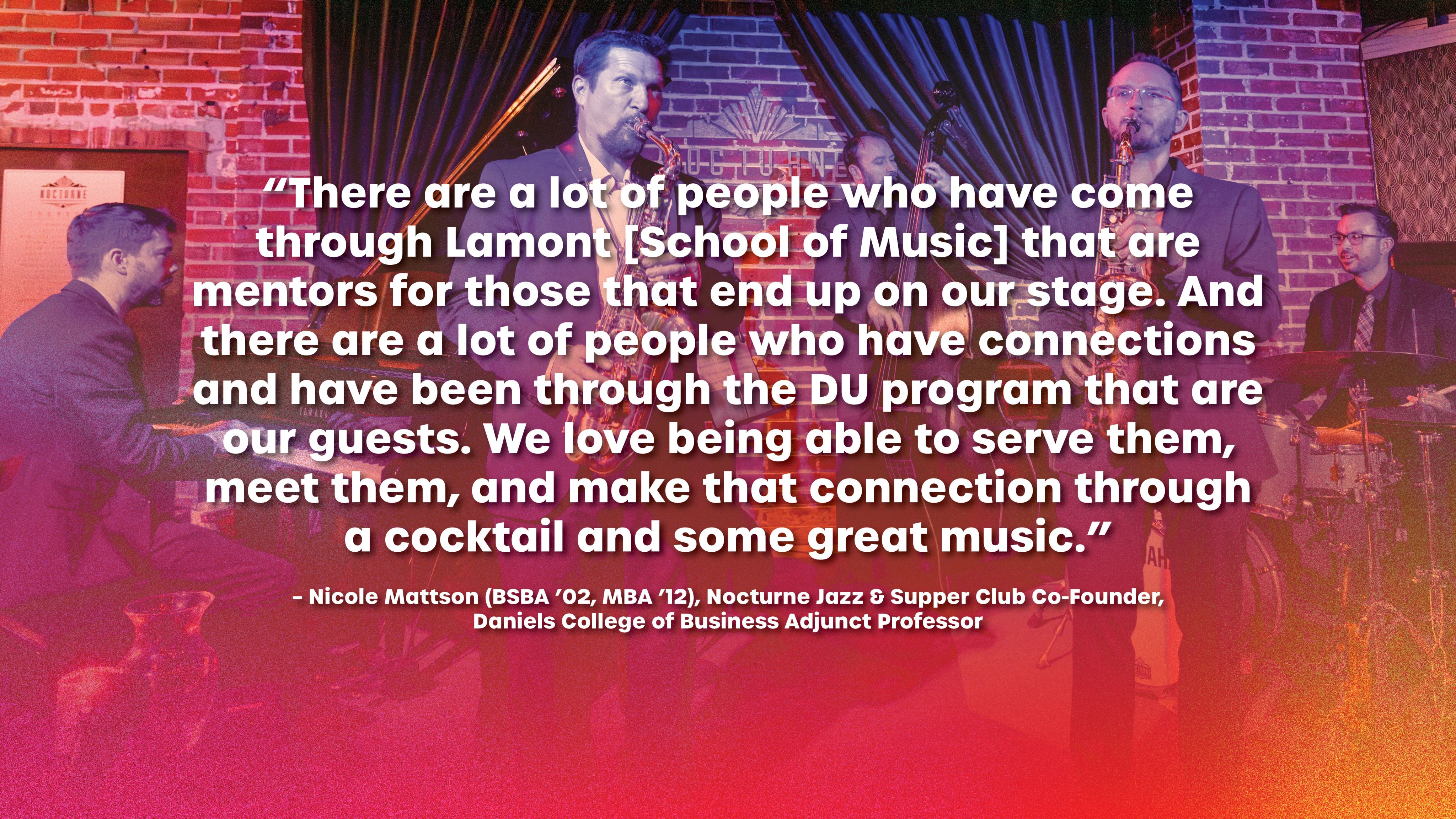 Owned and operated by alumna Nicole Mattson (BSBA ’02, MBA ’12), an adjunct professor in the Daniels College of Business, and her husband Scott, Nocturne Jazz & Supper Club has paired next-level eats and classic cocktails — some of which pre-date the origins of Denver’s jazz scene — with performances from Colorado’s finest jazz musicians since 2015.